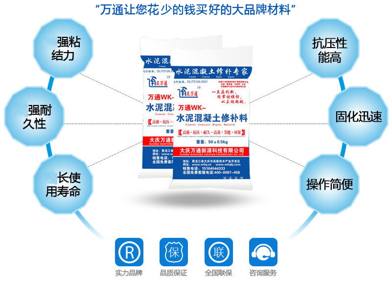 大慶萬通新源科技有限公司獨有的混凝土路面高強速補料,是水泥混凝土路面病害修復的好材料。疲勞、凍融循環、彎曲壓力、滲水和基層破壞等原因都會引起水泥路面的破損,從而帶來高昂的維護費用。與以往的剛性修補方法不同,混凝土水泥路面維修速補膠提供了一種獨特的柔性修補產品和技術,高柔性、高抗拉性,可跨伸縮縫施工和高抗壓性使得混凝土快補產品為水泥混凝土路面提供了******性的修補。傳統的剛性修補方案,如環氧砂漿和快干水泥產品,由于其自身的粘結失效,抗疲勞性低以及與原路面不同的伸縮系數,修補面會在短時間內失效或產生新的裂縫,需要反復修補,有效期短且費用高昂。大慶萬通新源科技有限公司的混凝土水泥路面維修速補膠可以隨原路面一起伸縮,移動,從而避免了粘結失效和產生新裂縫。萬通快補產品優異的粘結性、柔韌性和高防滑性,特別適用于水泥路面的淺層粘合修補,多邊角混凝土板層修補,跨伸縮縫修補以及路面沉陷修補。萬通混凝土病害修補料針對混凝土起皮起沙、斷板裂縫、蜂窩麻面、坑槽露石子、漏筋掉皮、橋梁的掉皮漏筋快速通車使用時間長。應用萬通快補產品,施工后一天就可以恢復交通。大慶萬通新源科技有限公司的萬通水泥路面維修速補膠適用于高速公路、機場路面、農村村村通路面、廠坪、學校操場、市區公路、小區路面、橋梁、水泥路面的修補。使用萬通特快補材料修補路面可以一勞永逸! 水泥地面起砂怎么辦,混凝土修補劑混凝土地面起砂,混凝土地面修補,地面起砂怎么辦,